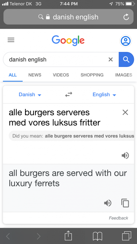 As you can see in this translation from a menu in Copenhagen, Google says the hamburger restaurant is serving up luxury ferrets.