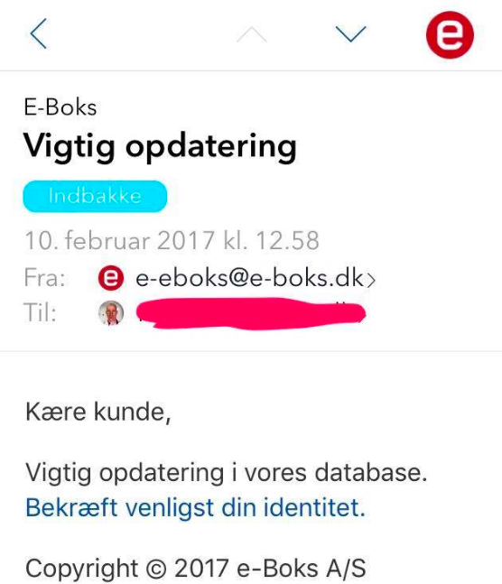 E-Boks sent out a warning about a phishing email in 2017 that said, “Important update in our database. Please confirm your identity,” and provided a link.