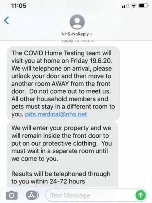 One message tells you a home testing team will visit you at home on a certain date, according to the Chartered Trading Standards Institute in the United Kingdom.