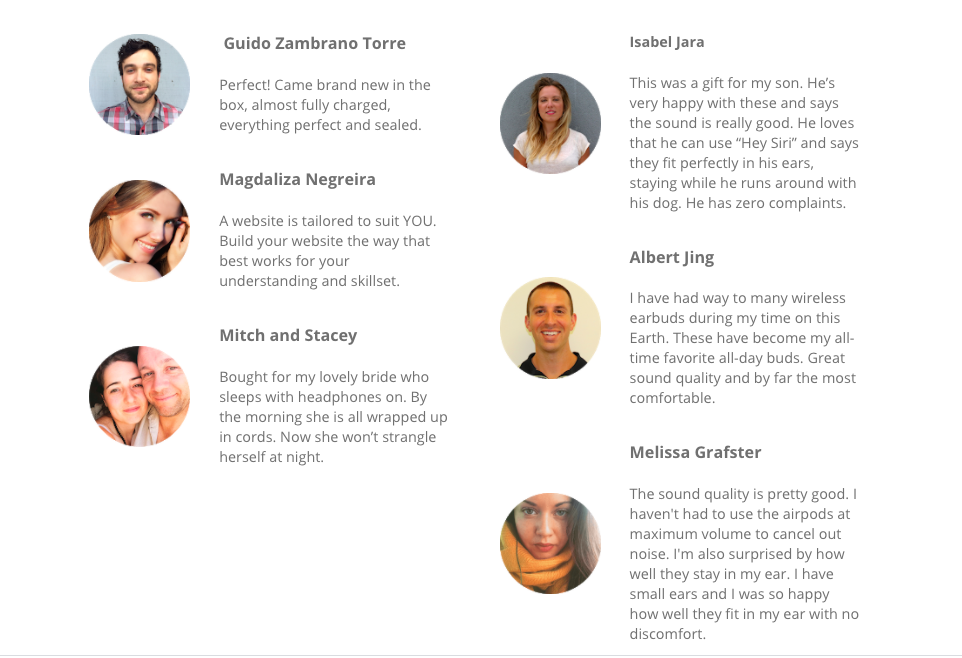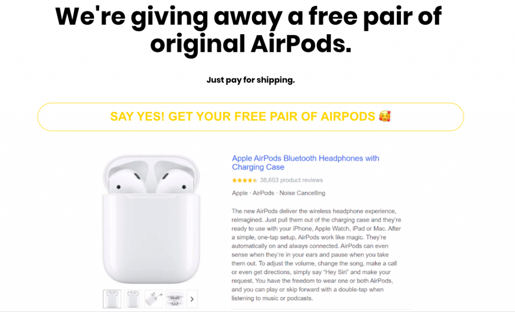 AppleProductSales claims, “We’re giving away a free pair of original AirPods. Just pay for shipping,” and features the same customers, including Magdaliza Negreira, Guido Zambrano Torre, and Mitch and Stacey.