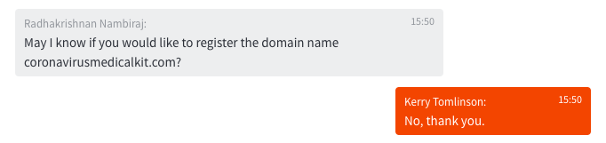 “May I know if you would like to register the domain name coronavirusmedicalkit (dot) com?” the rep asked.