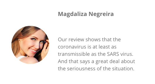 A “customer” named Magdaliza Negreira writes, “Our review shows that the coronavirus is at least as transmissible as the SARS virus. And that says a great deal about the seriousness of the situation.”
