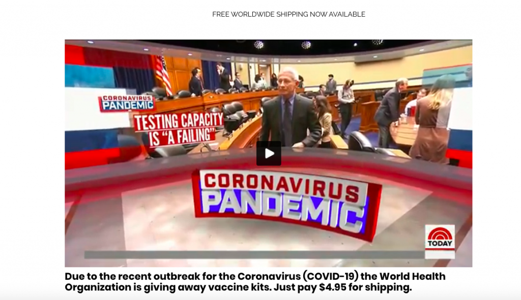 “Due to the recent outbreak for the Coronavirus (COVID-19) the World Health Organization is giving away vaccine kits. Just pay $4.95 for shipping,” the site CoronavirusMedicalKit (dot) com read.