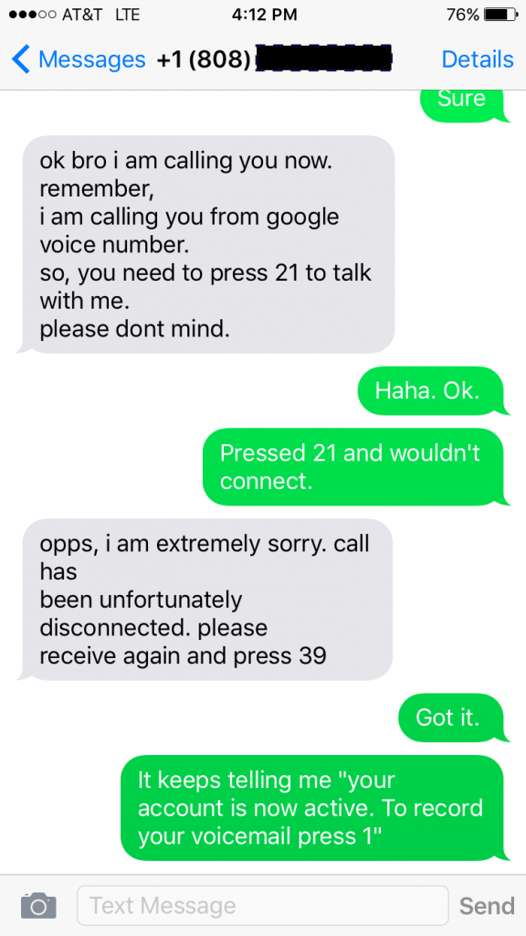 “This phone is now linked to a Google Voice account with the phone number (555)555-5555. If this is correct, enter 1, if not, enter 2.”