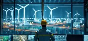 Engineer working in control room, overseeing the performance of a wind farm on multiple screens, utilizing AI-driven systems to maximize efficiency and sustainability. Generative AI.
