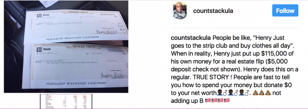“People be like, ‘Henry Just goes to the strip club and buy clothes all day,’” CountStackula wrote on that Instagram post. “When in reality, Henry just put up $115,000 of his own money for a real estate flip ($5,000 deposit check not shown). Henry does this on a regular. TRUE STORY!”