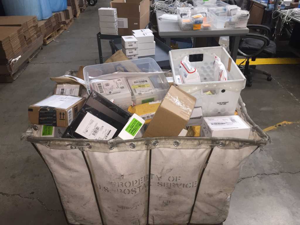 Boxes and boxes of used phones, sent by mail, are stacked in a warehouse cart.