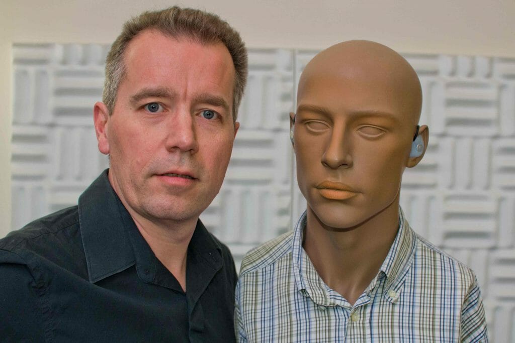 Stephane Pigeon shows his custom in-ear microphones he used to record his cat’s purr. Image credit: Stephane Pigeon