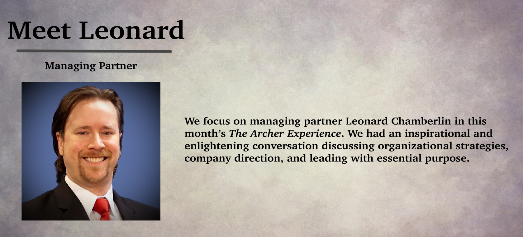 As a managing partner and consultant, Leonard brings a magnified level of expertise and passion to Team Archer and its clients by providing a high level of dedication, fresh ideas, and continued support.