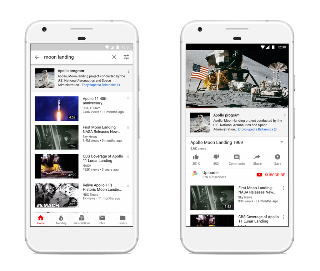 If you search for videos about things like the moon landing, where conspiracy theories abound, you’ll also get info from sites like Wikipedia and Encyclopedia Britannica.