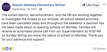 Glacier Gateway Elementary in Montana reported threats after a cyber attack in September 2017.