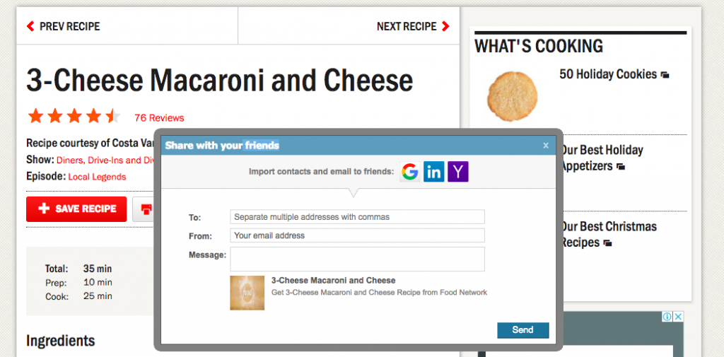 Example of a send-to-a-friend form on a recipe site. Image credit: Foodnetwork.com