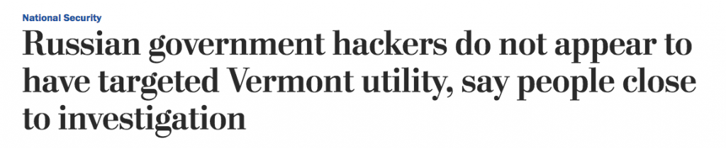 One of the headlines from Washington Post articles about “Russian hacking” of Burlington Electric.
