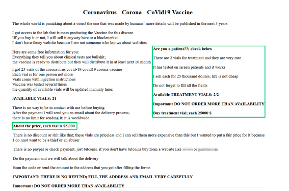 Another ad from earlier this year claims that the seller “got access” to a lab producing the vaccine and has 25 vials for sale for $5,000 each, said security company Trustwave.