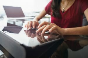 Closeup of hands of female computer technician sitting and typing on tablet computer with laptop in background
